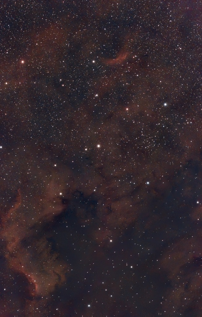 The North America Nebula (NGC 7000 or Caldwell 20) is an emission nebula in the constellation Cygnus, close to Deneb (the tail of the swan and its brightest star) in the night sky. It is named because its shape resembles North America. It is a large object and only a portion can be see here. The North America shape is pointed downward toward the right.