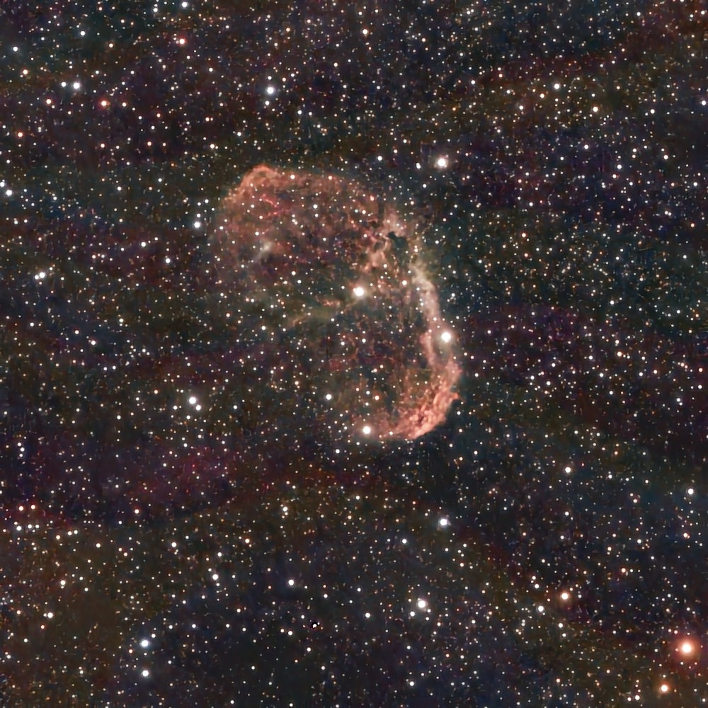 The Crescent Nebula (also known as NGC 6888 or Caldwell 27) is an emission nebula in the constellation Cygnus, about 5000 light-years away from Earth. It was discovered by William Herschel in 1792. It is formed by the fast stellar wind from the Wolf-Rayet star WR 136 (HD 192163) colliding with and energizing the slower moving wind ejected by the star when it became a red giant around 250,000 to 400,000 years ago. The nebula is a rather faint visual target, but with a telescope the nebulosity can be seen, and perhaps the rounded E shape that looks like the Euro symbol.