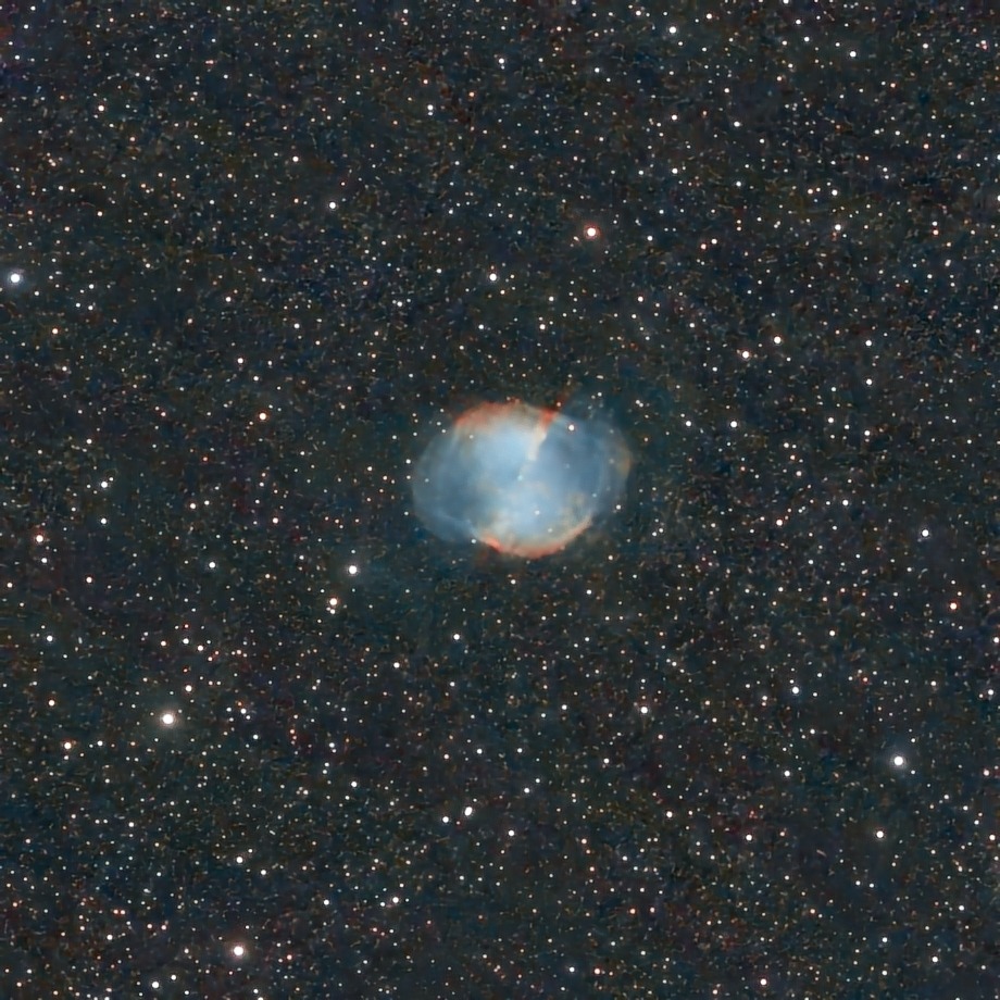 The Dumbbell Nebula (also known as the Apple Core Nebula, Messier 27, and NGC 6853) is a planetary nebula (nebulosity surrounding a white dwarf star, not a planet) in the constellation Vulpecula, at a distance of about 1360 light-years. It was the first such nebula to be discovered, by Charles Messier in 1764. At its brightness of visual magnitude 7.5 and diameter of about 8 arcminutes, it is easily visible in binoculars and is a popular observing target.